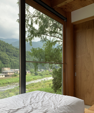 처음엔 주민들이 참여해서 직접 지어올린 숙소라고 해서, 약간은 어수선한 모습이 아닐까 했는데, 전혀. 숙소는 침대와 화장실이 전부였지만 하지만 더 필요한 것도 없이 심플하고 편했습니다. 통유리로 보이는 카미야마의 전경이 다했기 때문인데요. 밤에 벌레는 좀 있었지만… 아침에 맞이하는 이 싱그러운 풍경이 정말로 우리를 건강하게 만드는 것 같은 기분이 들었습니다.