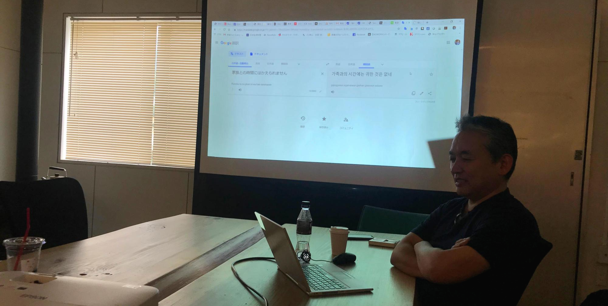 이후 강의를 듣기 위해 다시 KVSOC로 향했습니다. 15분쯤 시간이 흐른 후, 우리가 약속 시간을 잘못 알고 있는 것일까 걱정하려던 찰나, 검은 티셔츠에 청바지를 입어 한눈에 봐도 광고홍보 혹은 영상과 관련된 직업을 가졌을 것만 같은 남자가 들어왔습니다. ‘엔가와 오피스’의 대표 스미타씨였습니다.