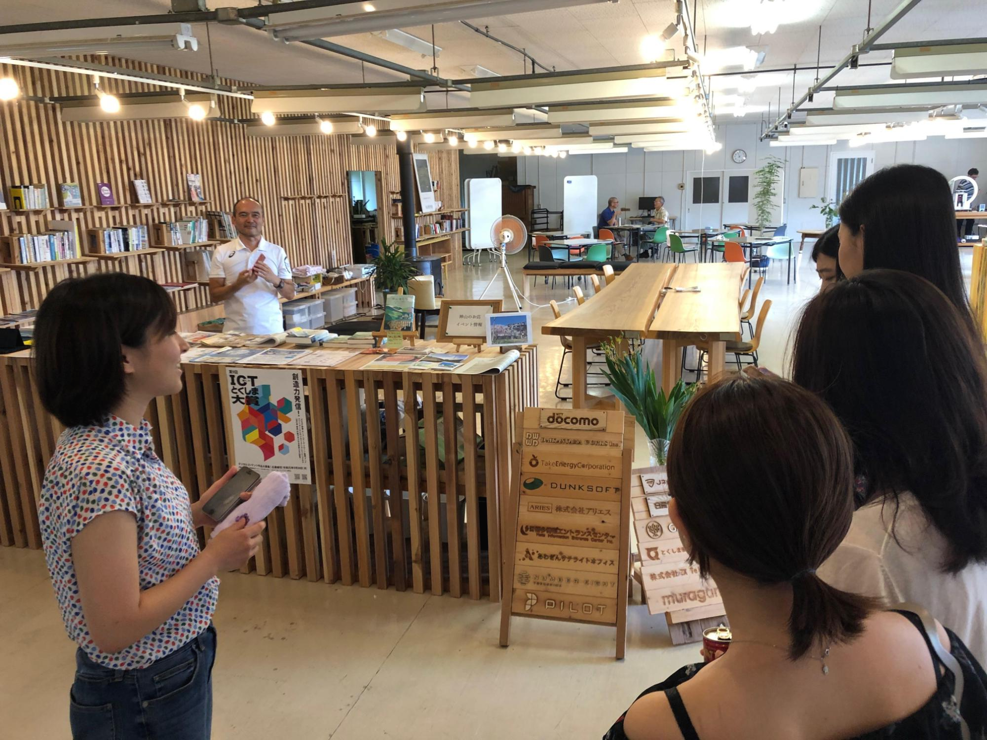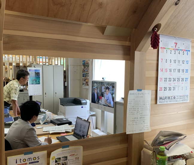 여기에 현재 입주해있는 회사들은 도청 지사, 도시락 배달회사, 디자인 회사, 프로그램 개발 회사 등이었는데요. 이 중 도청 지사는 처음 이 공간에 들어왔을 때부터 우리의 주의를 끌었습니다. 카미야마가 속해있는 도인 도쿠시마 도청의 직원들인 그들은, 본사직원들과 계속 화상으로 회의를 하고 있었습니다. 사실 요즘처럼 기술이 발달한 시대에 화상통화가 신기할 것은 없었지만, 깨끗한 스크린을 통해 마치 본청과 같이 있는 것처럼 일하는 모습이 굉장히 신선했습니다. 또한 공공기관이면 이러한 업무 환경에 대해 보수적일만도 한데, 개의치 않고 앞장서서 위성사무실을 만든 것이 대단하기도 했습니다.