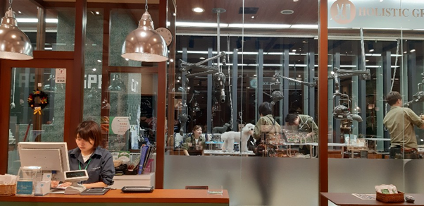 GREEN DOG에서 눈에 띄었던 점은 애견 미용 공간이 완전히 통유리로 되어 있어 안쪽을 훤히 들여다볼 수 있다는 것이 특징이었습니다. 애견이 미용하는 모습을 한눈에 확인할 수 있으니 Green Dog이 제공하는 서비스에 대한 신뢰도가 높아지는 느낌을 받기도 했습니다.