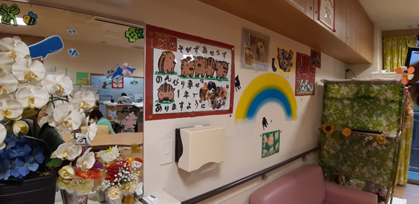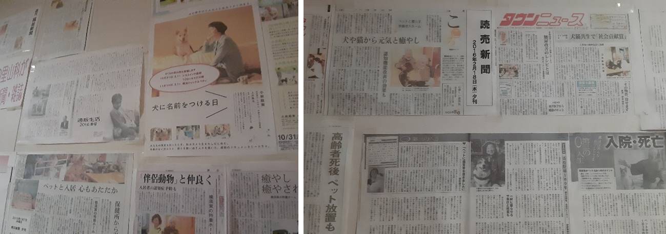 요양원 내부 벽면에는 여러 매체에서 인터뷰한 신문기사가 붙어 있었는데요, 일본에서도 반려동물과 함께 입주할 수 있는 요양원으로 매우 유명한 곳이라 많은 매체에서 취재와 인터뷰 요청이 온다고 합니다.