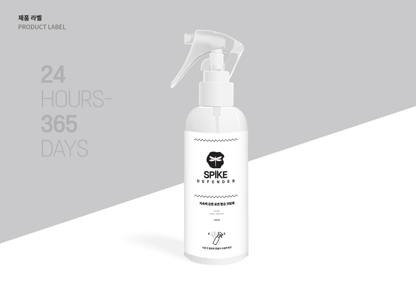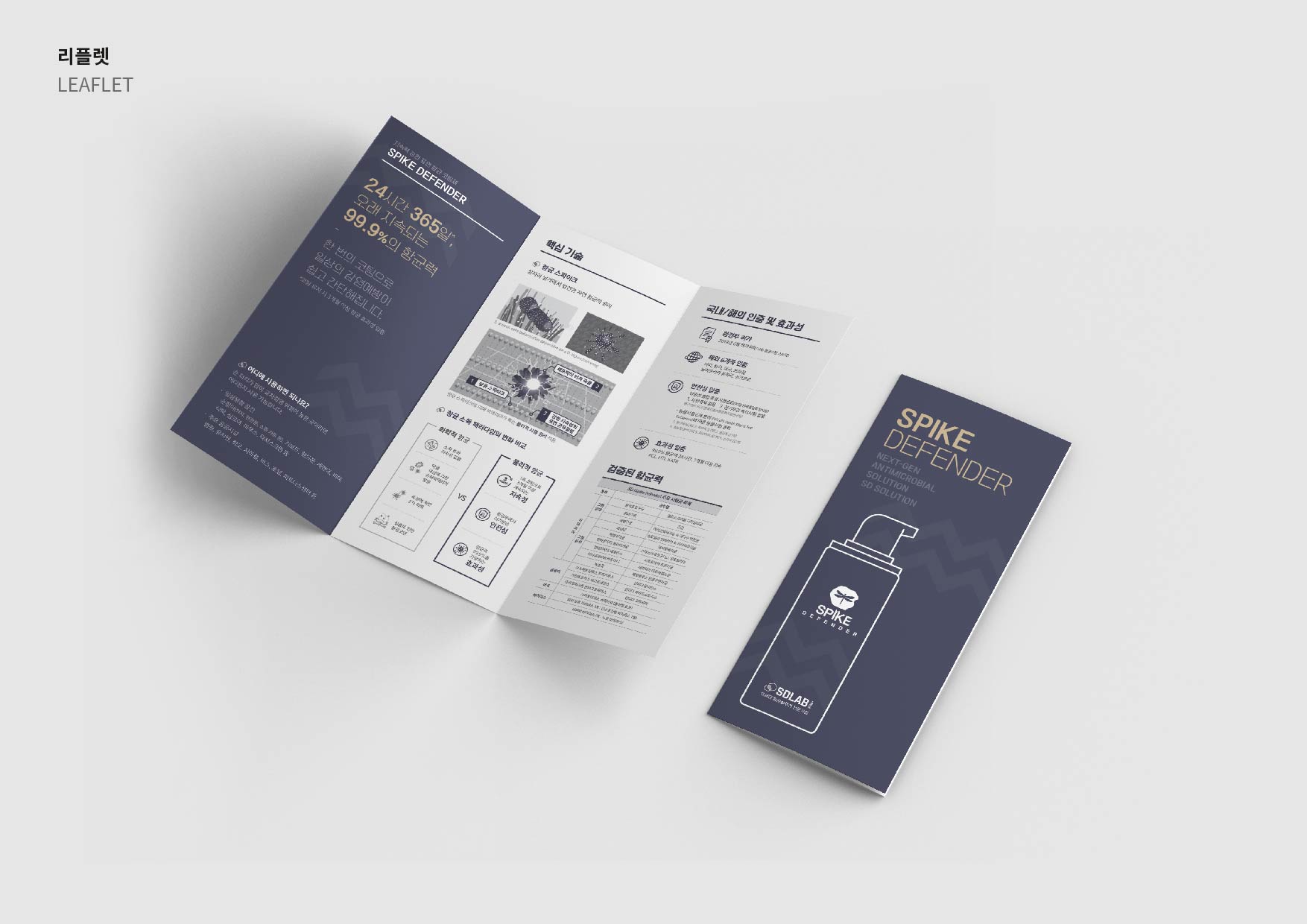 리뉴얼 결과 글로벌 시장 진출을 고려해 '지속력 강한 표면 항균 코팅제' SPIKE DEFENDER라는 새로운 영문 네이밍을 개발하고, 브랜드 스토리와 기술의 원리를 함축한 상징으로 로고를 완성했습니다. 여기에 제품과 사용방법 등을 소개하는 리플릿을 제작해 패키지의 완성도를 높였습니다.