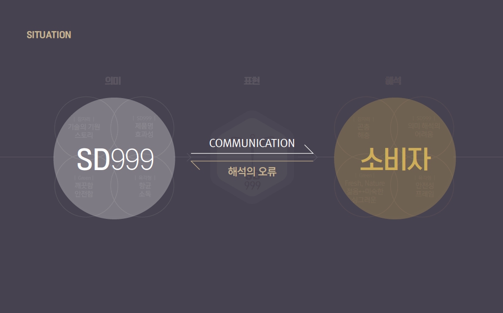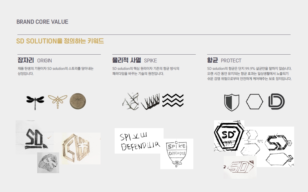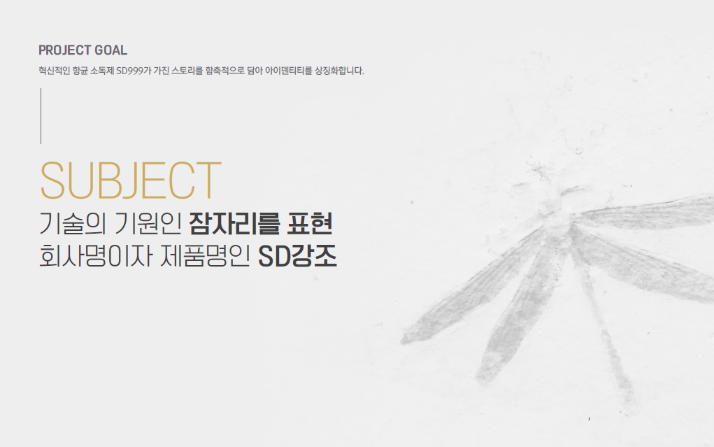'지속력 강한 표면 항균 코팅제'로 제품의 속성을 규정하는 태그라인을 부여한 뒤, 잠자리 화석에서 시작된 제품의 기원 스토리, 기술의 원리인 항균 스파이크, 그리고 99.9% 항균력으로 감염으로부터 안전하게 일상을 지켜주는 베네핏을 상징할 수 있는 이미지 개발을 거쳐 최종 적으로 SD999의 디자인을 완성했습니다.