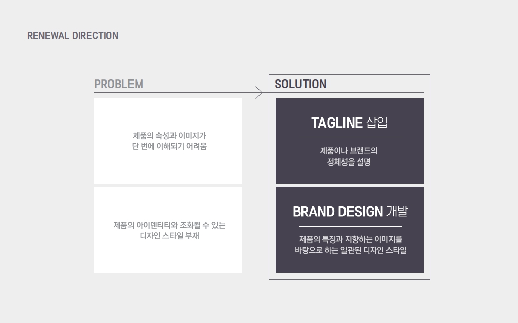 기존 로고에는 여러 가지 의미가 담겨있지만 제품을 처음 접하는 소비자에게 의미가 완전하게 전달되지 못하는 한계가 있었습니다. 디자인 본부에서는 '이 제품이 무엇인지'를 설명해 줄 수 있는 태그라인 삽입과 새로운 네이밍, 그리고 제품의 스토리와 원리를 담고 있는 고유한 디자인 개발을 목표로 설정했습니다.