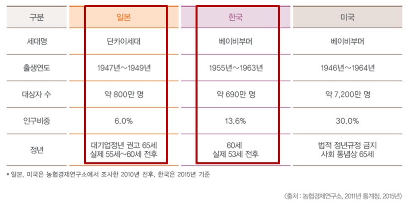 ◆ 여기서 잠깐!! 일본 시니어 세대에 대한 이해를 돕고자 간략히 정리해 보았습니다. 현재 초고령 사회와 시니어 문화를 주도하고 있는 세대는 일본의 베이비붐 세대라 할 수 있는 단카이 세대 (団塊の世代 단카이노세다이). 일본의 경제 고도 성장기에 태어났으며 자산 보유액이 다른 세대보다 높다고 합니다. 우리나라 베이비붐 세대보다 대략 10년 정도 선배들입니다. 이렇듯 앞서서 본격화되고 있는 일본의 시니어 성장 기록과 성과는 다가올 우리나라 시니어 소비 문화를 예상하는데 중요한 교과서와 같습니다.