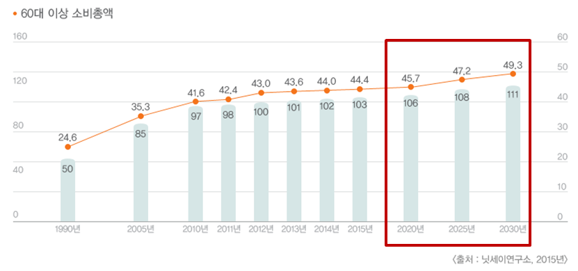얼마나 경제력이 있을까? 일본 닛세이기초연구소 (NLI Research Institute) 보고서에 따르면 2015년에 일본 60세 이상 고령자의 소비 규모가 100조엔을 기록하였습니다. 일본 전 인구의 1/3이 65세 이상이 된다는 2030년에는 일본 전체 소비 규모의 대략 50% 가량을 시니어 세대가 주도할 것으로 전망하고 있습니다. 미래 거대 소비자가 시니어라는 것. 일본의 ‘시니어 시프트(Senior Shift)’ 물결과 맥락을 같이 합니다.
