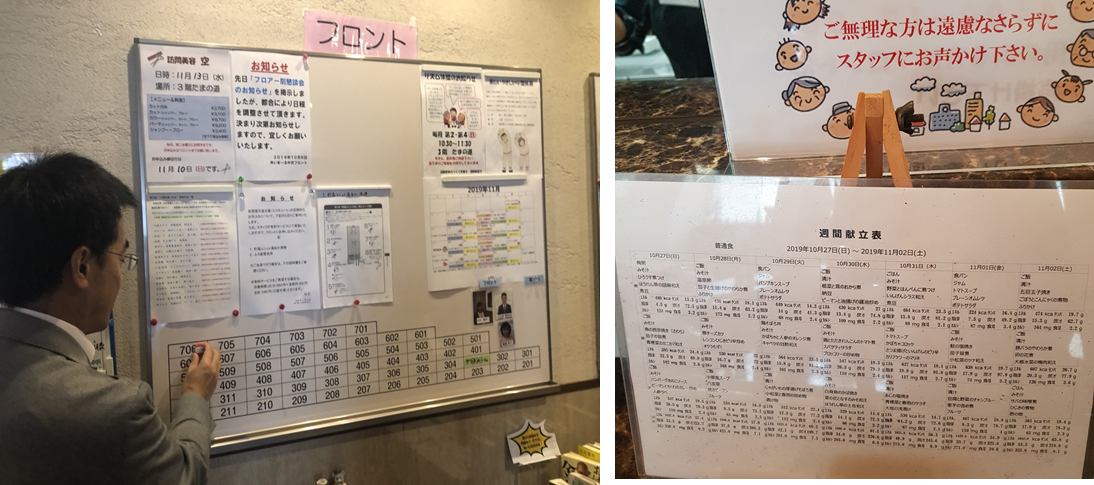 ◆ 나카자와 로비에서는 아침마다 자연스럽게 출석체크가 이뤄집니다. 기상 후에 로비에 게시판 아래 정렬된 방번호 자석을 자신의 룸번호에 부착하는 것. 관리자들은 부착되어 있지 않는 호실은 해당 관리자가 방문해 입주자의 상태를 체크합니다. 로비에 게시된 한 주간 스케줄표에는 음악, 취미, 놀이 등 다양한 프로그램 일정이 빼곡히 기록돼 있습니다. 프로그램은 지역민과 학생들이 자원봉사자로 참여해 함께 하고 있다고 합니다.