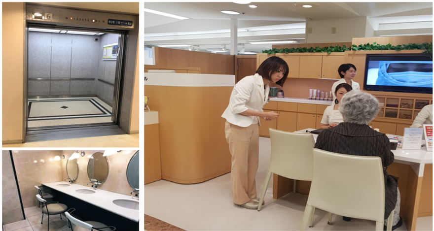 엘리베이터도 일반 백화점에 비해 넓고, 개폐 시간도 16초로 긴 편. 매장 곳곳에는 15~20cm 정도 낮은 의자가 설치되어 있고, 계단 손잡이 높이도 65~85cm로 낮습니다. 옷걸이도 시니어들의 낮은 키를 고려해 150cm 정도로 낮추었다고 합니다. 화장실에는 앉아서 손을 닦을 수 있도록 의자가 놓여져 있습니다.