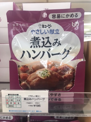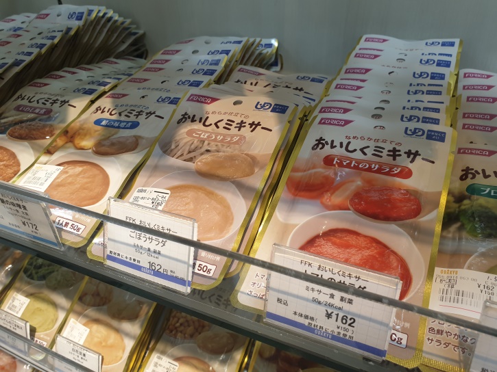 성인용 기저귀와 함께 진열되어 있던 케어푸드는 아사히에서 나온 케어푸드로 역시 유니버셜 디자인 푸드 기준이 적용된 음식이었습니다. 식사를 대신할 수 있는 메뉴들이 대부분이었고 백화점처럼 디저트 상품은 찾아볼 수 없었습니다.