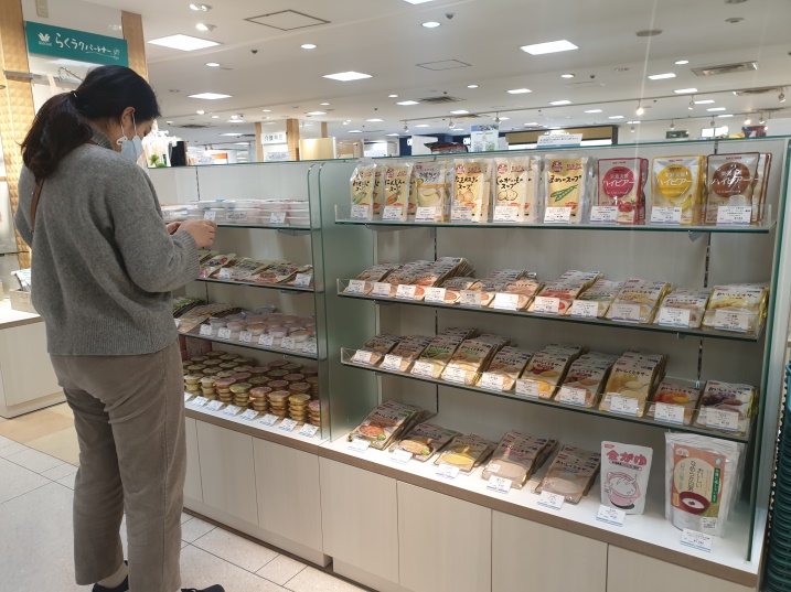 환자식과 같이 분류되던 개호 식품이 케어푸드 산업으로 발전해서인지, 혹은 아직 활발한 시장이 아니어서인지 알 수 없었지만 오다큐 백화점에는 케어푸드와 환자식을 함께 진열해놓은 것이 특이점이었습니다. 그래도 오다큐 백화점 역시 진열대 하나를 차지하는 정도의 케어푸드를 취급하고 있었지만 게이오 백화점과 마찬가지로 다양한 시니어 용품을 찾아볼 수는 없었습니다.