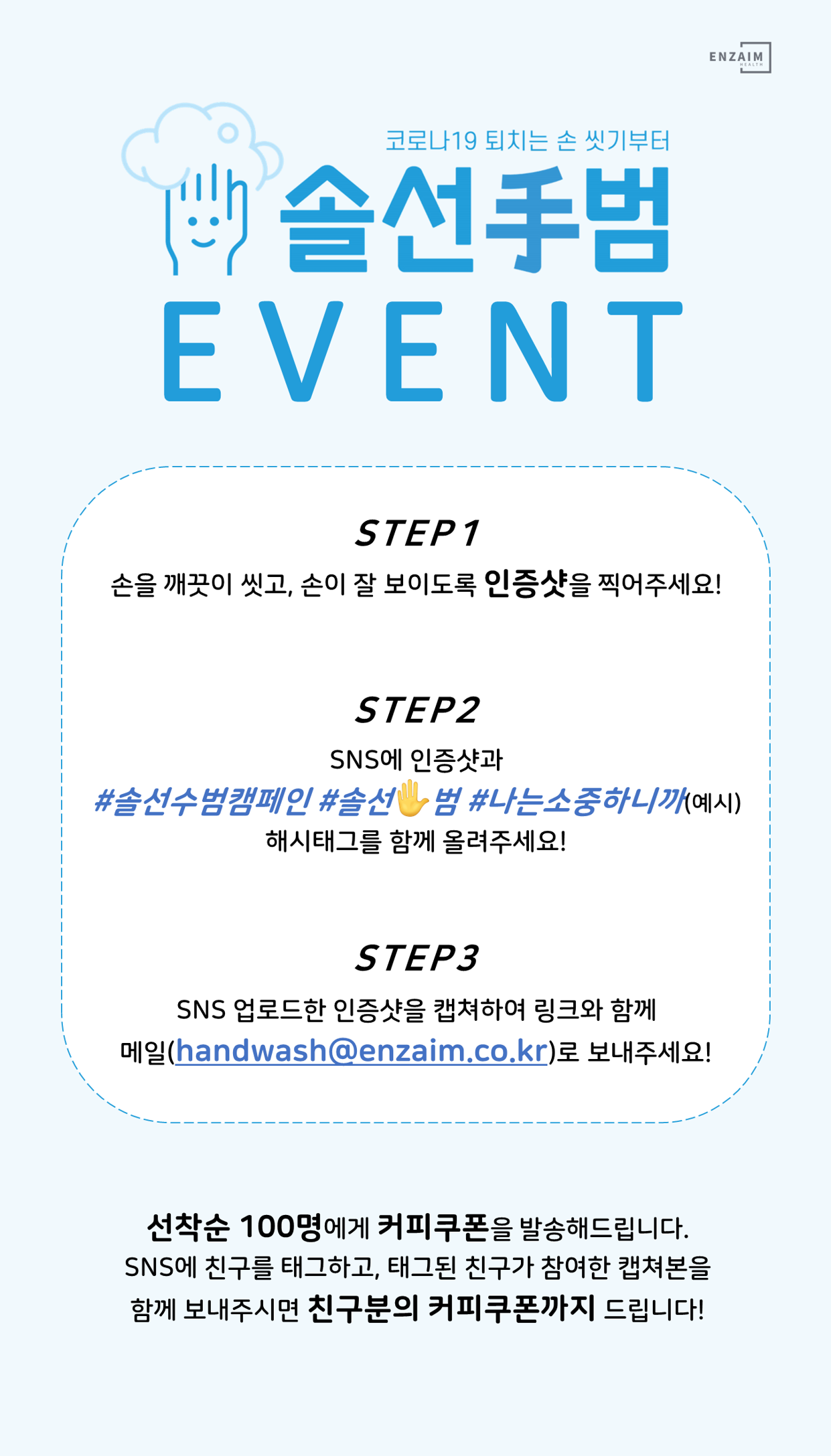 STEP3) SNS 업로드한 인증샷을 캡쳐하여 링크와 함께 메일(handwash@enzaim.co.kr)로 보내주세요!