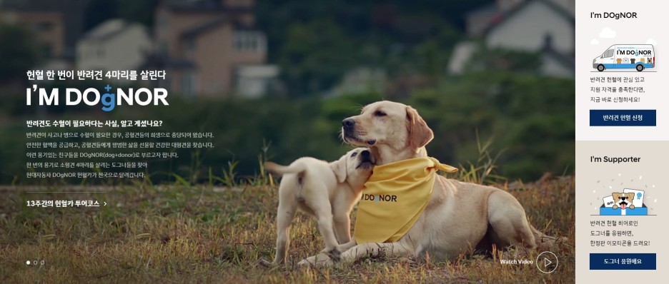 이런 사실을 알리기 위해 현대자동차에서는 한국헌혈견협회, 건국대 수의대학과 함께 ‘아임 도그너(I'M DogNor): 찾아가는 반려견 헌혈카’ 캠페인을 진행했습니다. Dog와 Donor의 합성어로 지어진 캠페인 이름처럼 일반 강아지들이 헌혈에 참여한 캠페인이었는데요.