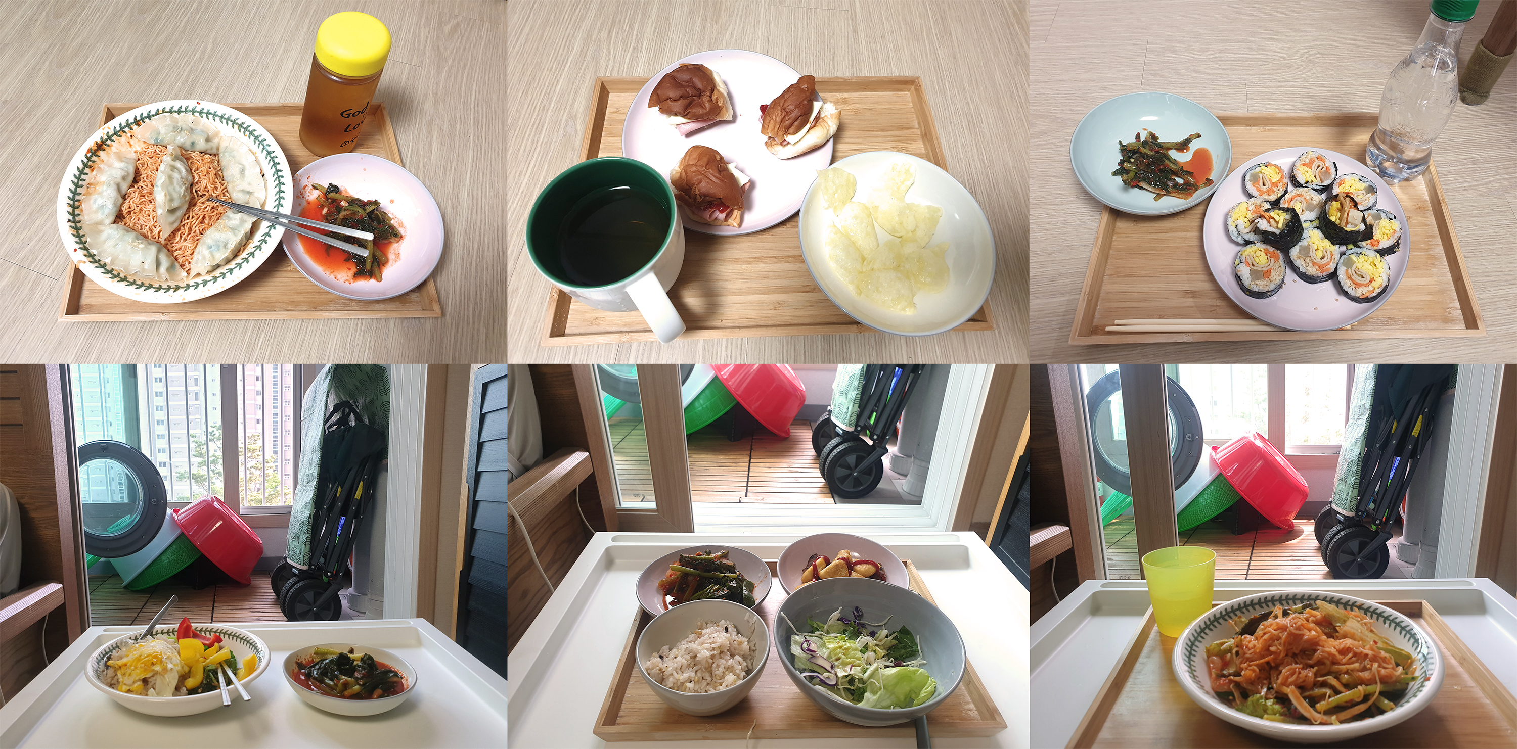 자가 격리 내내 삼시 세끼에 간식까지 꼬박꼬박 챙겨준 고마운 가족들. 식사는 아들과 친정엄마가 방 앞에 놔주면 받아서 먹고 다 먹은 그릇은 안방 화장실에서 1차 헹굼을 한 후 소독약을 마구 뿌려 다시 방 밖에 내어 놓는 식으로 진행했다. 초기에는 일회용 그릇을 사용해 먹고 바로 버리는 식으로 진행했지만 갇힌 공간에서 음식물이 묻은 쓰레기가 점점 쌓여가니 냄새도 나고 벌레도 생기는 것 같아 비위생적이더라. 자가격리자의 쓰레기는 해제전까지는 버릴 수도 없으니 대안으로 최소한의 그릇만 고정적으로 사용하고 소독을 철저히 하는 것으로 방역을 진행했다.
