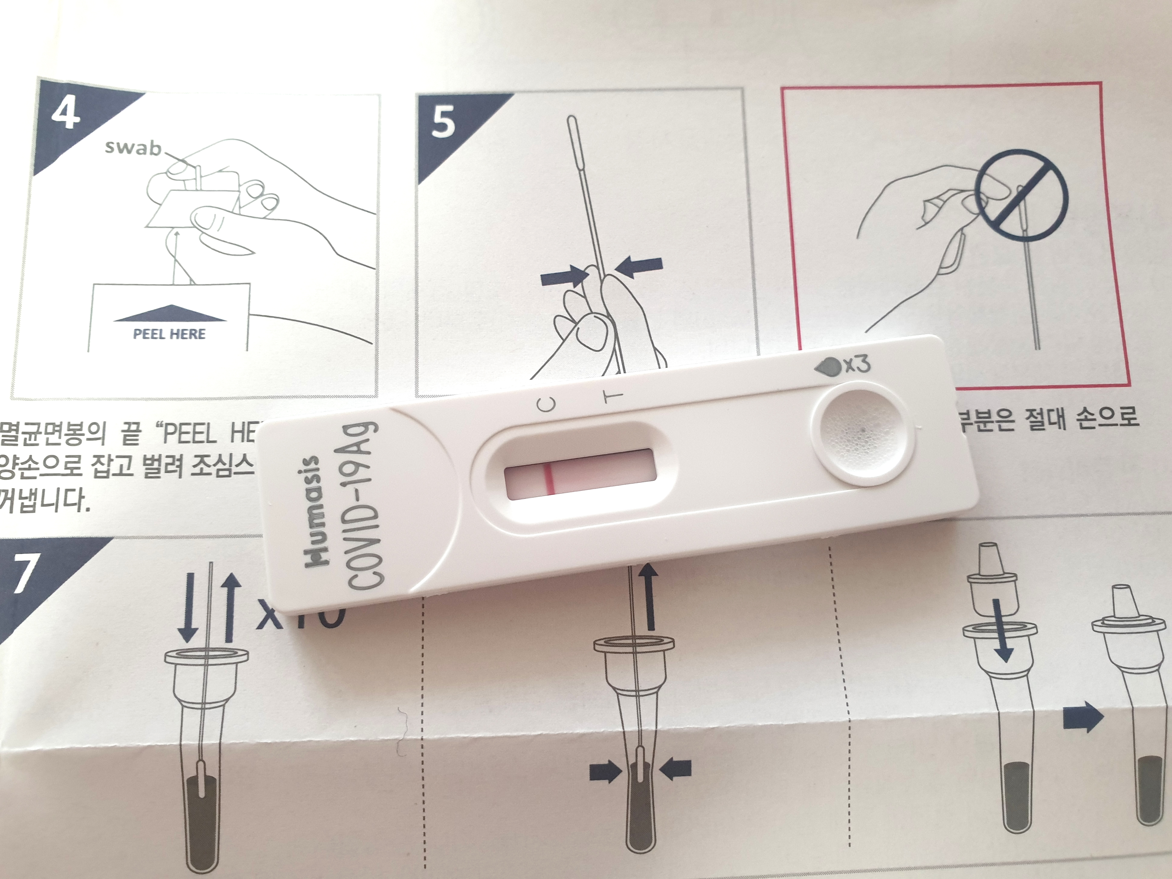 그 와중에 라면은 나에게도 아주 유용한(?) 아이템이었다. 격리 기간 중에 남편에게 부탁하여 코로나 자가 진단 키트를 구매해놨는데 어느 정도 콧물이 있어야 더 정확한 결과를 얻을 수 있다고 하는데 더운 날씨에 콧물이 쉽게 나오지 않더라. 내 손으로 콧속 깊이 면봉을 넣는 것은 겁나고 오매불망 콧물 나오기만 기다리고 있었는데 라면을 먹다 보니 콧물이 슬슬 나오더라ㅎㅎ 이때다 싶어 급하게 먹던 것을 내려놓고 검사를 진행했다. 검사는 설명서만 보면 누구나 할 수 있도록 쉽게 구조화되어 있다. 1차 선별검사소에서 음성이 나왔지만 더위 속에 미열이 지속되면서 의심의 끈을 놓을 수 없었다. 한 번 더 '괜찮음'을 확인받자는 마음에 검사를 진행했고 결과를 기다리는 동안 임신 테스트기와 비슷한 모양새에 선이 변해가는 상황을 바라보며 정말 오묘한 기분이 들었다^^;;; 다행히 검사 결과는 음성으로 나왔고 이때부터는 조금 더 편안한 마음으로 지낼 수 있었다.