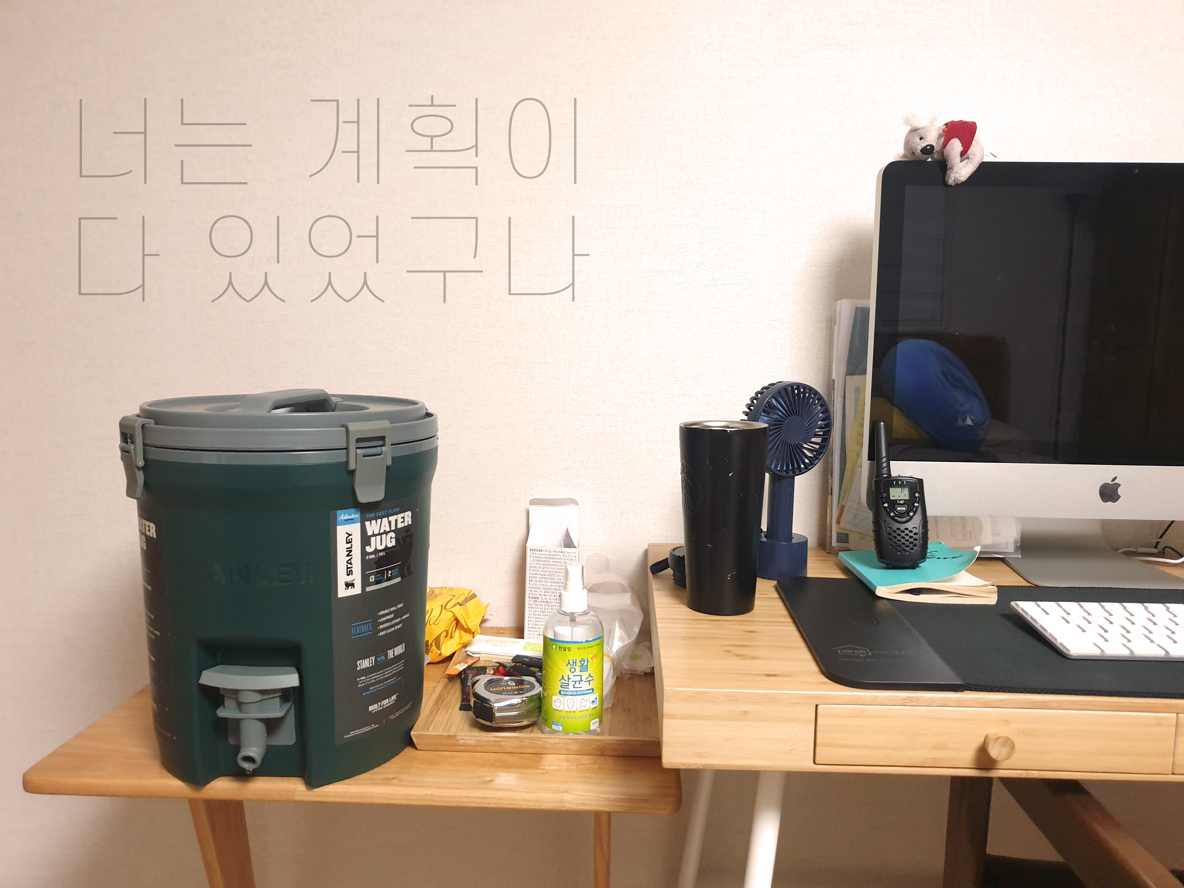 자가 격리를 하며 제일 힘들었던 것은 더위와의 싸움이었다. 한 여름에 마침 에어컨이 설치 안된 안방에서만 있으려니 땀이 주룩주룩... 자주 환기를 해야 해서 창문을 열어 놓으니 바깥의 더운 열기까지 한몫해 안 나던 열도 나는 것 같았다. 그래서 그런지 격리 내내 체온은 36.8~37.2도. 나중에는 캠핑 장비로 사용하던 대용량 물통에 얼음을 가득 채워 냉수도 먹고 아이스 아메리카노도 타 먹었다. 방옥에서 먹는 아이스 아메리카노 맛이란 정말ㅠㅠ. 거실에서 바닥 생활을 해야 하는 남편도 캠핑용 자충 매트를 활용하며 둘은 그렇게도 원하던 캠핑(?)을 즐길 수 있게 되었다. 얼마 전 구입한 캠핑 장비들이 이렇게 빛을 발할 줄이야! 너는 계획이 다 있었구나!