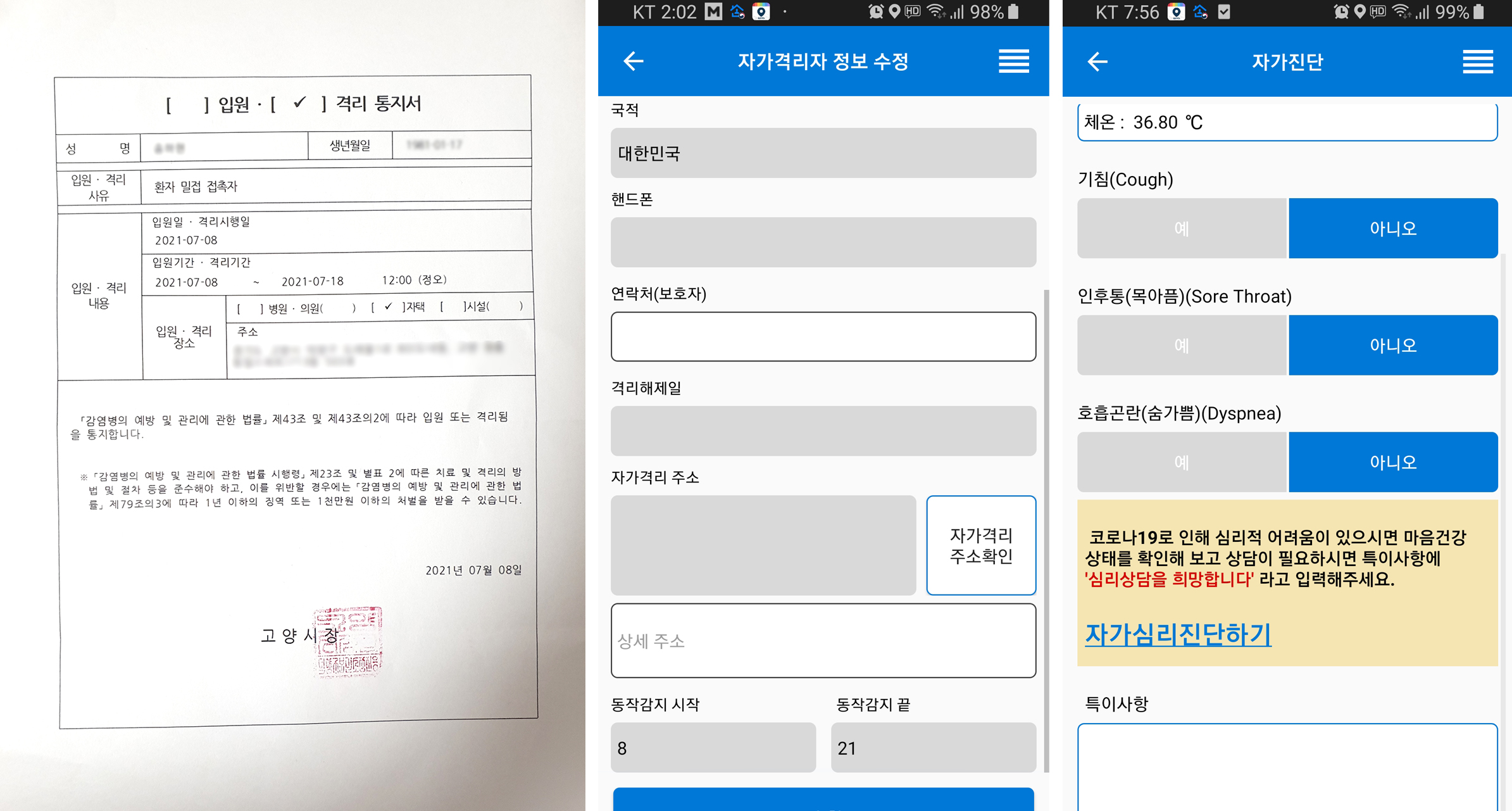 자가 격리가 시작되면 보건당국으로부터 통지서를 받게 되고 그때부터는 법적 효력이 발생한다. 담당 공무원이 배정되고 안내 문자가 오면 자가 격리 앱을 깔고 개인 정보와 자가 격리 주소를 입력해야 한다. 그리고 아침저녁으로 하루에 두 번씩 앱에 나의 상태를 남겨야 하며 GPS가 무조건 켜져 있어야 하고 핸드폰이 꺼지지 않도록 잘 유지해야 한다. 실시간 위치 추적을 하다보니 배터리가 생각 보다 빨리 닳아 잘 때도 충전기가 빠져 있지는 않은지 몇 번을 체크하며 긴장을 해야 했다.