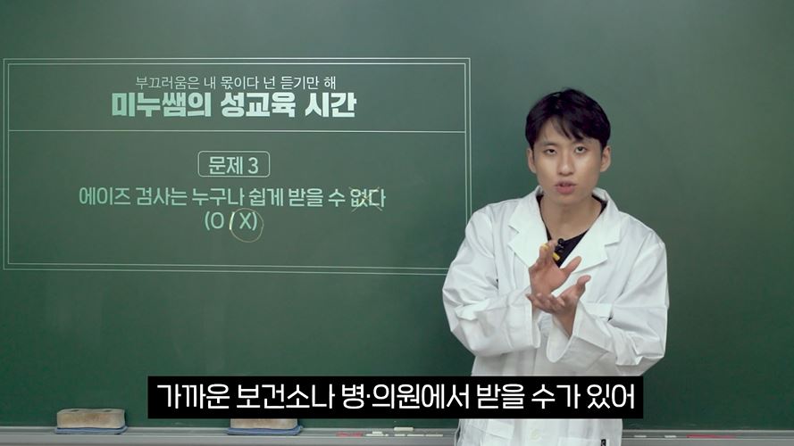 이번 콘텐츠는 '미누쌤의 성교육 시간'이란 타이틀로 강의와 문제풀이를 진행하는 컨셉을 통해 쉽고 재미있게 정보를 전달하고자 하였으며, 올바른 콘돔 착용 실습 등 실질적인 정보를 포함하여 흥미롭고 효과적으로 에이즈 예방 행동을 독려하고 있습니다.