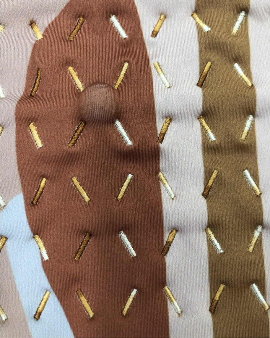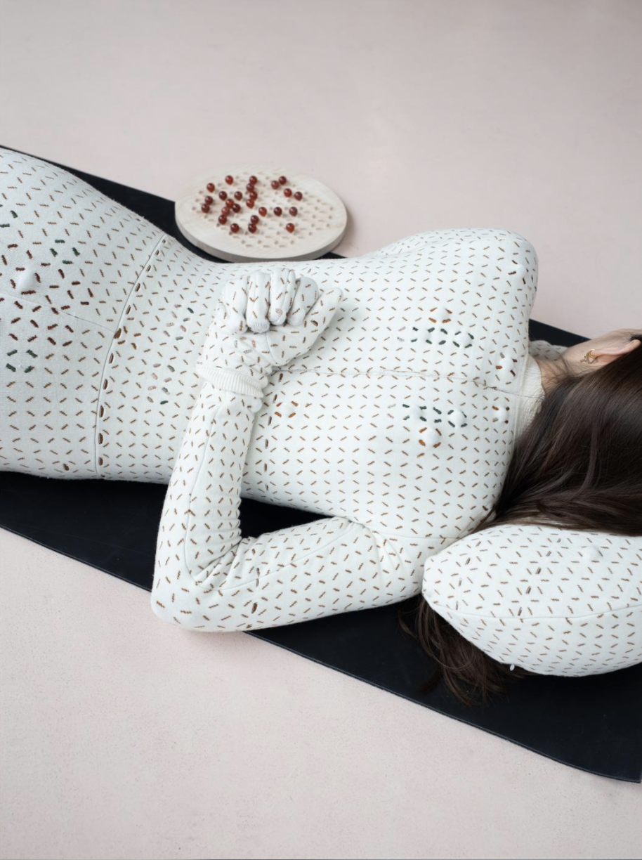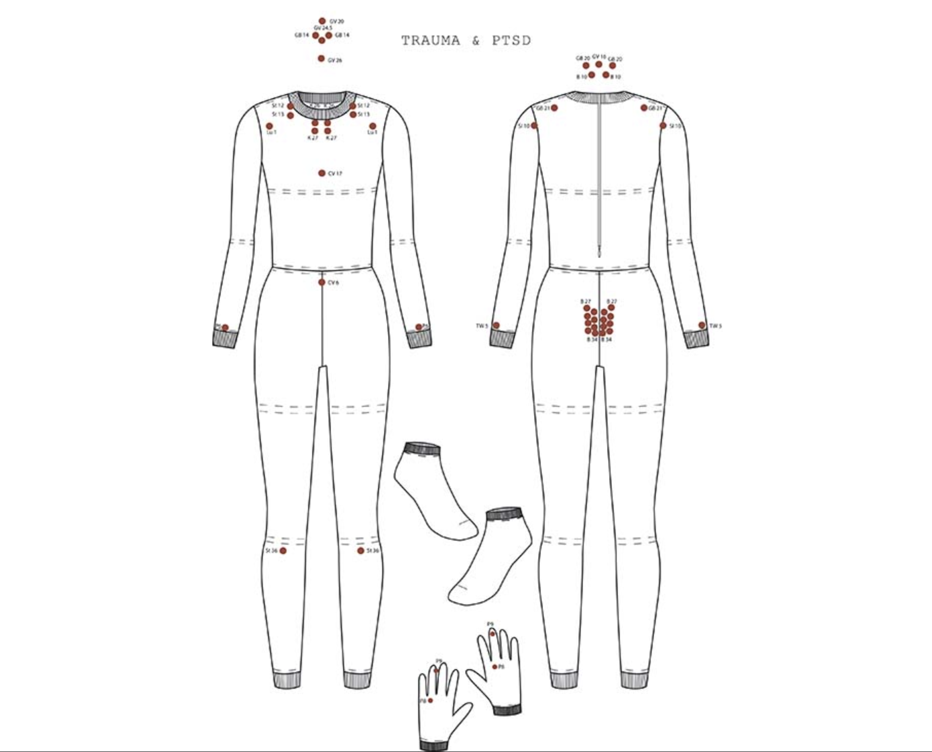 네덜란드의 에인트호번 디자인 아카데미 졸업생인 Laura Deschl은 동양의학의 지압과 요가의 움직임을 기반으로 구성한 바디수트인 ‘힐링 임프린트’를 개발했다. 억눌린 기억, 감정인 트라우마가 자신의 신체와 자아 감각이 단절을 하고 있는 상태라 보고, 지압과 훈련을 통해 몸에 안정적인 자극을 주며 이를 극복해 나갈 수 있다고 본 것이다. 바디라인을 그대로 살린 옷에는 마사지 볼을 삽입할 수 있는 구멍이 있고, 볼을 고정할 수 있는 규칙적인 스티치가 배치되어 있다. 탄성실과 재활용 니트 에슬레저 섬유로 만들어 탈착에 용이하며 전반적으로 저 채도의 파스텔 컬러를 사용해 편안한 느낌을 준다. 착용 후 요가의 움직임을 이용해 자신의 체중으로 직접 지압하는 방식이며 바디수트, 장갑, 양말, 베개가 한 세트이며 증상 별로 마사지 볼의 위치를 알려주는 삽화도 함께 들어있어 이용에 도움을 준다.