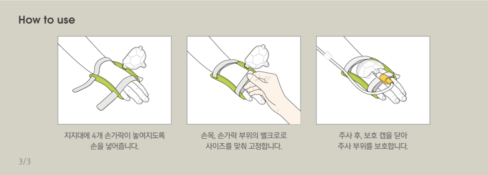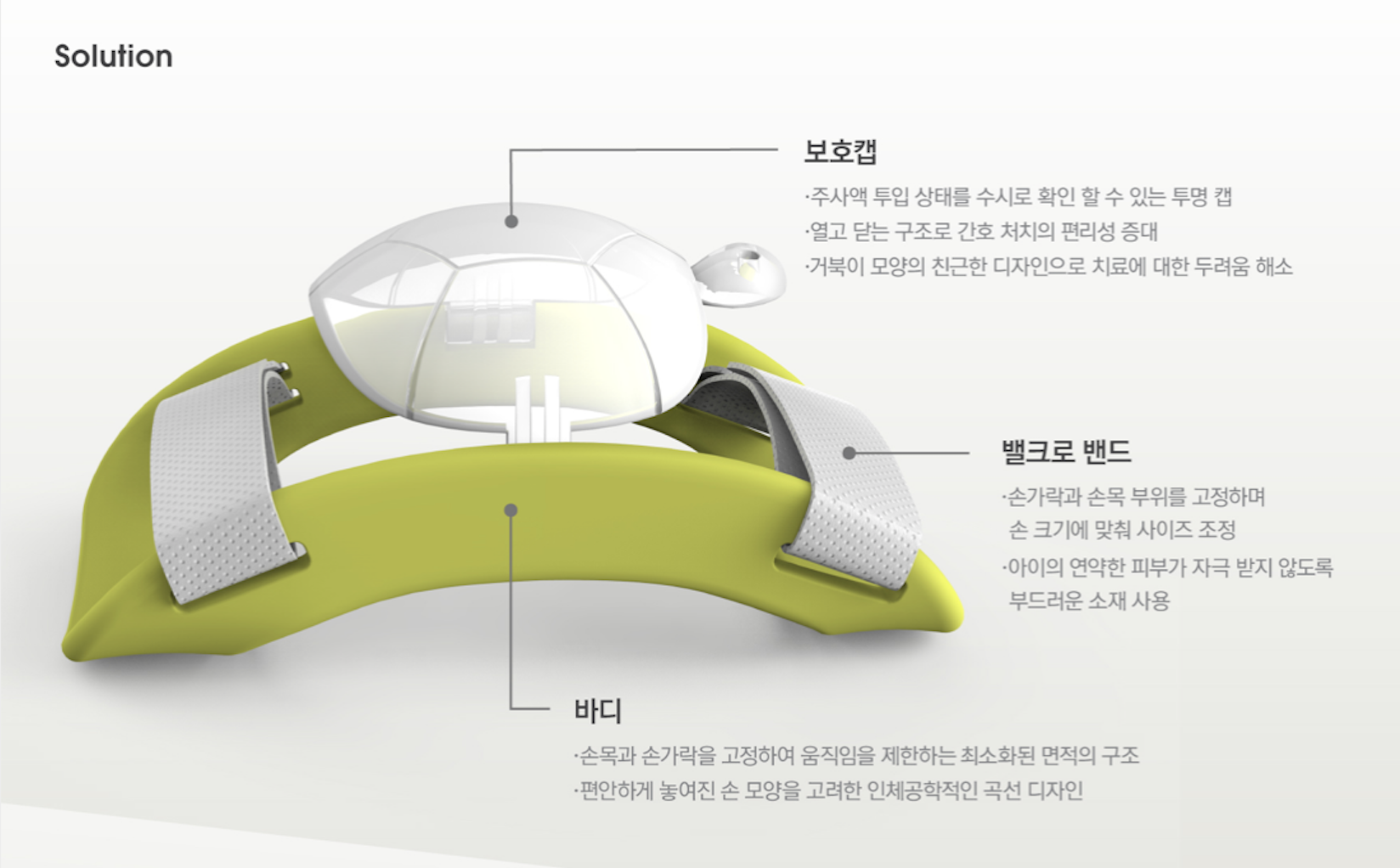 ‘아이링거’는 이러한 문제 해결을 위해 거북이 모양의 오픈형 캡 형태 보호대로 고안되었다. 링거 바늘을 보호하기 위해 손등은 돔 형태로 구성하고, 의료진이 처치 시 편리하도록 오픈형 캡으로 설계하였다. 또한 보호 캡은 거북이 형태로 디자인하여 아이들로 하여금 재미요소를 주어 친근감을 갖도록 유도했다. 바디 부분은 최소한의 면적으로 손과 손목을 얹어 고정할 수 있도록 설계하여 편안함을 높이고, 고정 부위는 손 사이즈에 따라 자유롭게 조절이 가능하도록 부드러운 벨크로 소재로 편의를 높였다. ‘아이링거’는 디자인과 효용성을 인정받아 2018년 K-DESIGN AWARD와 제 53회 대한민국디자인 전람회에서 각각 ‘위너’와 ‘골드’로 수상한 바 있다.