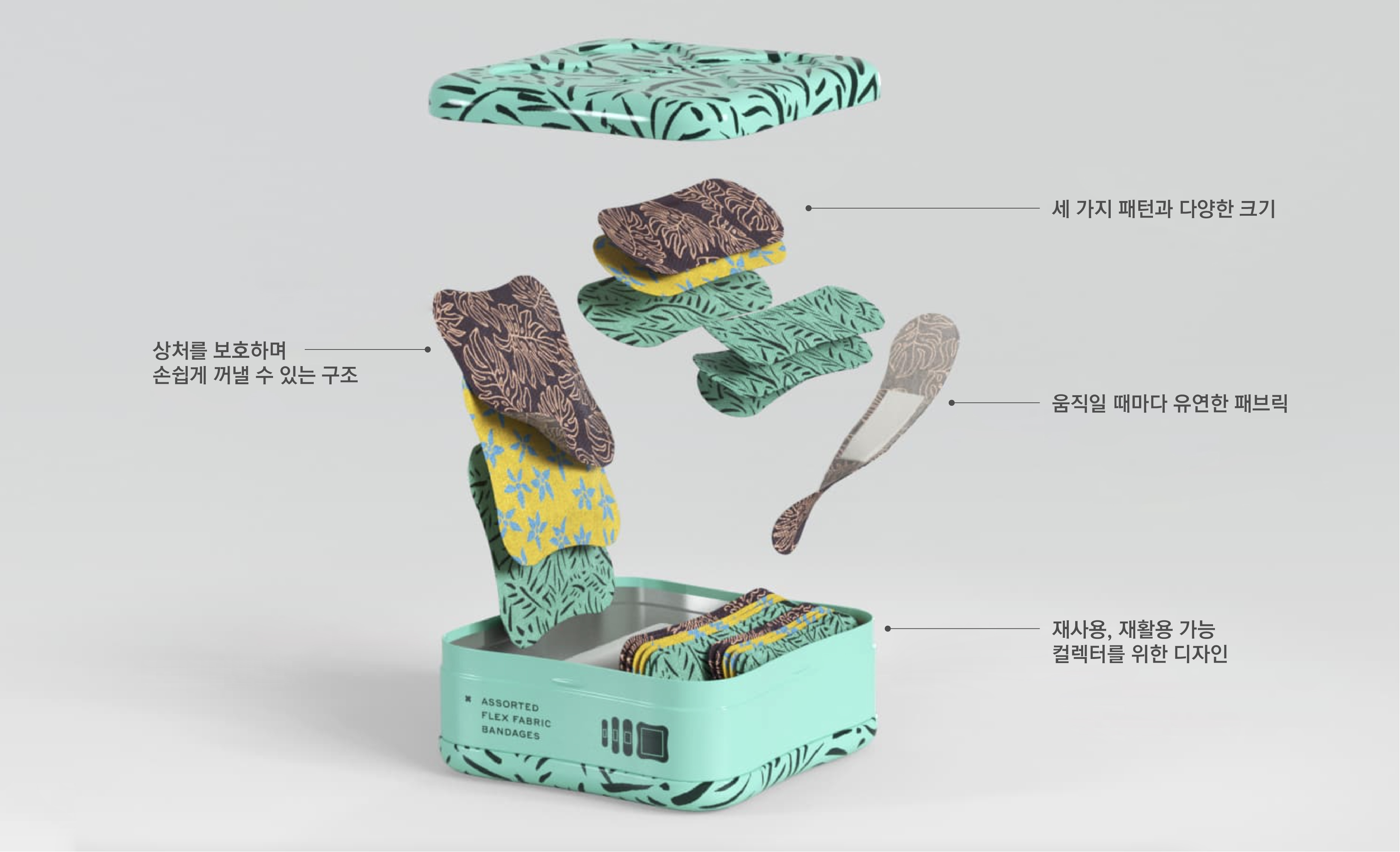 구급 밴드는 사용 대상에 따라 크게 두 가지로 구분되는데, 아이 눈높이에 맞춰 친근하게 다가갈 수 있도록 캐릭터 활용이 많은 유아용과 상처를 드러내지 않고 실용성과 위생에 초점을 맞춘 성인용이 있다. 우리에게 익숙한 성인용 일회용 밴드가 살구색이나 아이보리색인 이유는 오염 상태를 쉽게 확인함과 동시에 피부색과 비슷하게 하여 붙였을 때 반창고가 눈에 띄지 않게 하기 위해서다. 미국 제약회사 존슨앤존슨에서는 밝은 색부터 어두운 갈색 계열까지 유색인종을 위한 반창고도 출시했다. 이처럼 실용성이 우선시되는 성인용은 획일화된 의약품 패키지 카테고리 중 하나이다. 비슷비슷한 디자인의 구급 용품 제품 시장 속에서 유쾌한 콘셉트와 디자인으로 소비자의 니즈를 재해석한 웰리를 살펴보자.