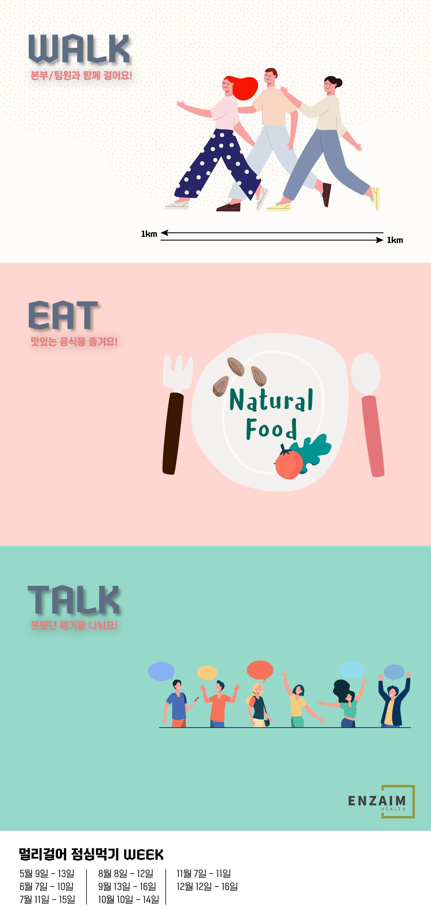 엔자임헬스는 임직원의 건강을 챙기는 동시에 생활의 즐거움을 제공하기 위해 ‘멀리걸어 점심먹기’ 프로그램을 꾸준히 실천하고 있습니다. 본부/팀별로 함께 하는 멀.걸.점. 프로그램은 5월부터 ‘일’ 단위에서 ‘주’ 단위로 확대 운영되어 본부원이 모두 함께할 수 있는 시간의 폭을 넓혔습니다. 멀.걸.점. 주간이 아니더라도 틈틈이 걷고 본부원과 함께 의미 있는 시간 자주 나누시길 기원합니다.