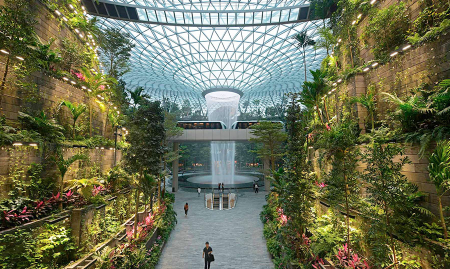 세계에서 가장 높은 실내 인공 폭포인 레인 보어텍스(Rain Vortex)로 눈길을 끄는 주얼창이공항은 싱가포르 창이공항의 각 터미널을 잇는 환승 허브로, 단순한 항공 편의시설을 넘어 싱가포르만의 개성을 담은 창의적인 모델로 평가되고 있다. 건물의 중심부에 위치한 레인 보어텍스는 높이가 무려 40m에 이르러 1분에 약 37,800L의 물이 쏟아져 역동적인 분위기를 연출한다. 이 폭포수는 빗물을 받아 재활용하는 것으로 건물의 실내 온도와 습도를 조절하도록 설계되었으며, 쾌적한 공기의 흐름을 조성하는 역할을 하고 있다.