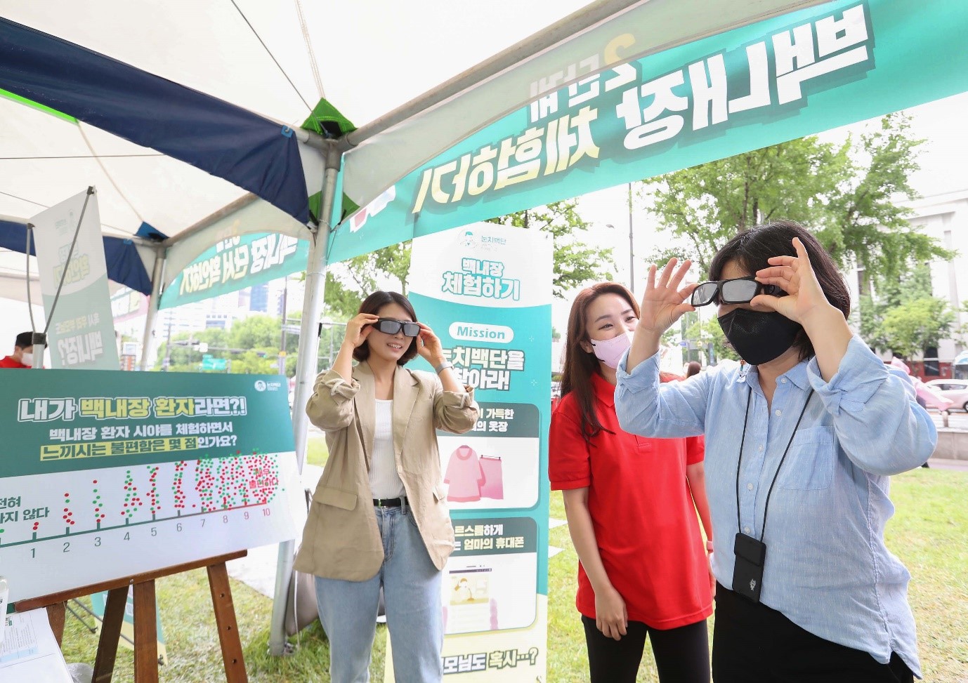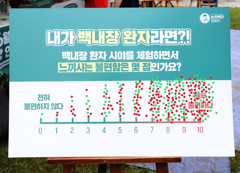 ‘백내장 체험하기' 프로그램에서는 특수 제작된 안경을 통해 백내장 환자의 시야를 직접 체험해 볼 수 있는 자리가 마련되어 시민들의 큰 호응을 얻었답니다. 백내장 안경 착용 시 느끼는 시력적 불편함에 대한 설문 조사도 있었는데요. 357명을 대상으로 한 설문 조사 결과, 백내장 시야 체험 후 10점 척도 중 7점 이상의 심각한 불편감을 호소한 시민은 82%로 백내장 환자가 실제 느끼는 시력적 불편함이 상당할 수 있음을 확인하기도 했습니다.