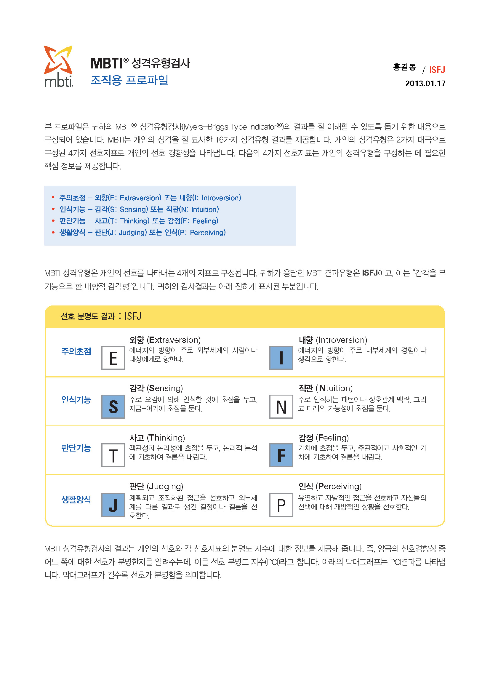 이번에 진행한 MBTI는 조직용 프로파일을 이용하여 개별의 성향에 따라 조직에서 어떤 리더십을 가지는지 살펴볼 수 있어서 더 좋았는데요. 선호하는 업무 환경 및 개발할 점도 점검되어 개개인의 성장과 조직 안에서의 소통에 도움이 되었을 것으로 기대합니다.