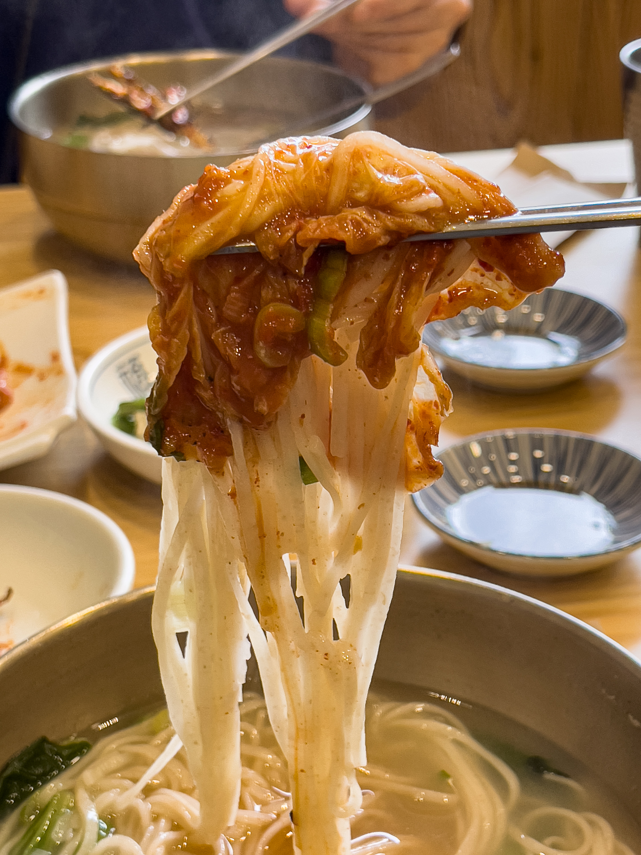 국수는 생각보다 바로 나오지 않았습니다. 나중에 알고보니 바로 자가제면해서 삶아 나오느라 시간이 좀 걸렸다고 합니다. 경북 스타일이라는 한우제물국시는 우리밀이라고 했는데요. 주인장께 여쭤보니 그게 메밀이었더라고요. 그것도 100% 메밀로 자가제면을 한 국수였습니다. 처음에는 별생각 없이 먹다가 보니 국수가 좀 다르더라고요. 면 안에 작은 알갱이가 틈틈이 박혀있었습니다. 메밀이 100%라서 국수가 금방 퍼진다고 하네요. 막 탱탱한 느낌의 국수를 원하신다면 맞지 않을 수도 있을 것 같습니다. 하지만 저나 찰리는 푹 익힌 국수를 좋아하는 편이라 나름 괜찮았습니다. 국물로 짜지 않고 슴슴한 간이 적당했고요. 전체적으로 깔끔하고 건강한 느낌이 컸습니다. 슴슴하다 보니 김치에 싸서 국수를 먹는 것도 나쁘지 않더군요. 주인 말씀으로는 메밀로 만들어 소화도 잘 될거라 하시던데 실제로 그렇더군요. 글루텐 가득한 면발을 먹었을 때와 달리 편한함이 있었습니다.